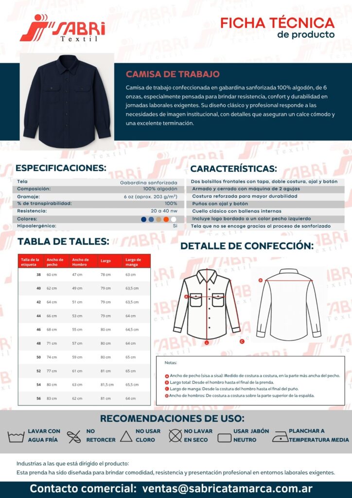 Camisa de trabajo confeccionada en gabardina sanforizada 100% algodón, de 6 onzas, especialmente pensada para brindar resistencia, confort y durabilidad en jornadas laborales exigentes. Su diseño clásico y profesional responde a las necesidades de imagen institucional, con detalles que aseguran un calce cómodo y una excelente terminación.